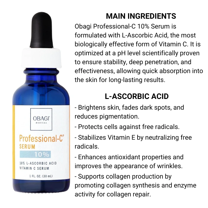 Apply five to seven drops of Obagi Professional-C Serum to the face, neck and chest using fingertips. Apply to cleansed skin in the morning before sunscreen and makeup application. A slight tingling may occur in some people, which diminishes with continued use.