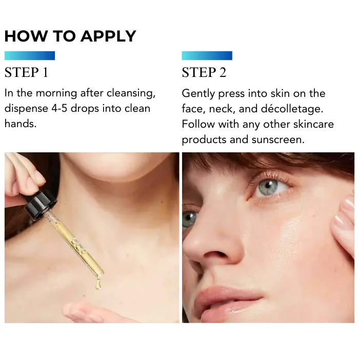How to Apply: Apply once a day in the morning, after cleansing and toning skin. Apply four to five drops to a dry face, neck and chest before your other anti-aging skin care products.